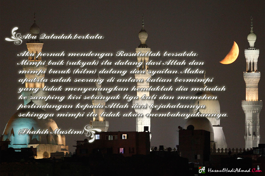 Aku pernah mendengar Rasulullah bersabda: Mimpi baik (rukyah) itu datang dari Allah dan mimpi buruk (hilm) datang dari setan. Maka apabila salah seorang di antara kalian bermimpi yang tidak menyenangkan hendaklah dia meludah ke samping kiri sebanyak tiga kali dan memohon perlindungan kepada Allah dari kejahatannya sehingga mimpi itu tidak akan membahayakannya. (Shahih Muslim No.4195)