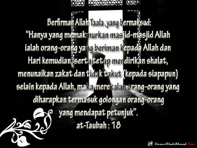 “Hanya yang memakmurkan masjid-masjid Allah ialah orang-orang yang beriman kepada Allah dan Hari kemudian, serta tetap mendirikan shalat, menunaikan zakat dan tidak takut (kepada siapapun) selain kepada Allah, maka merekalah orang-orang yang diharapkan termasuk golongan orang-orang yang mendapat petunjuk”. (at-Taubah : 18)